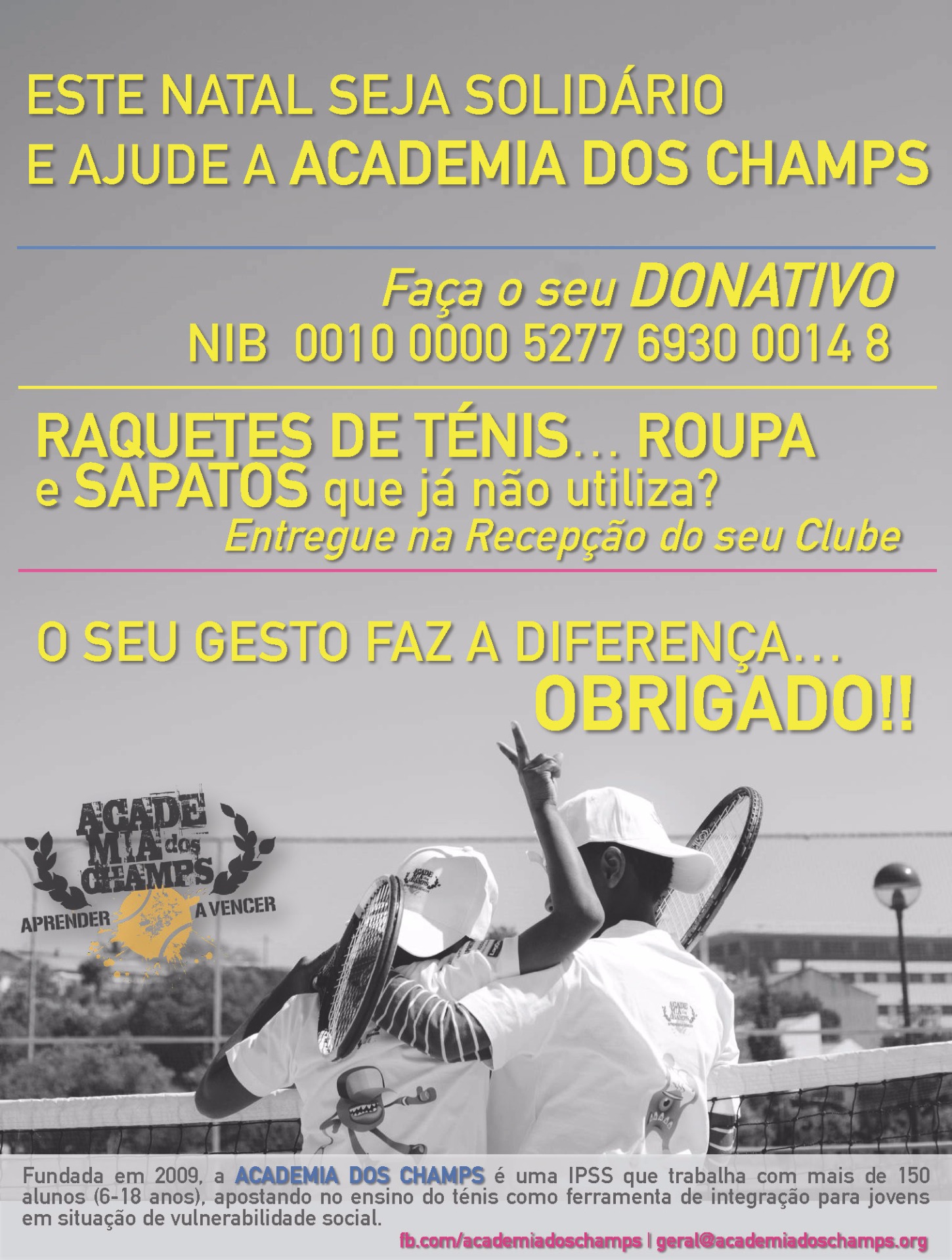 A FASTSPORTS junta-se a mais uma iniciativa de solidariedade, desta feita ligada directamente à sua principal área de intervenção, o Ténis e a favor da Academia dos Champs. Junte-se a nós e em plena época festiva colabore, partilhe e acima de tudo seja solidário.